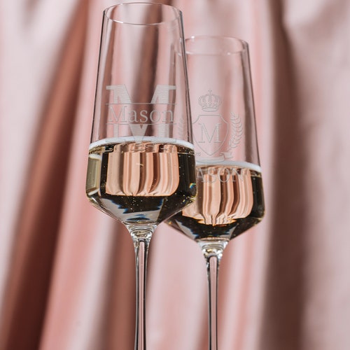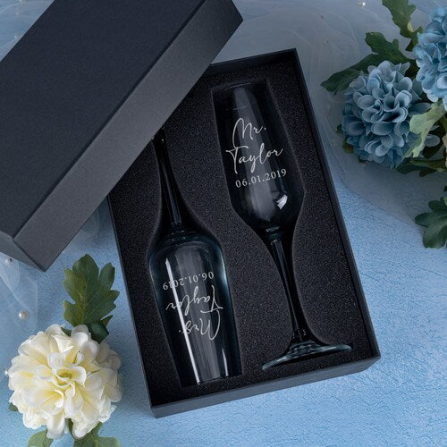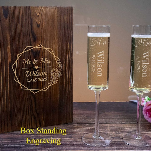 Mr. & Mrs. Toasting Glasses with Wooden Gift Box – Personalized Champagne Flutes