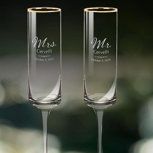 Engraved Mr. and Mrs. Gold Rim Champagne Flutes – Set of 2