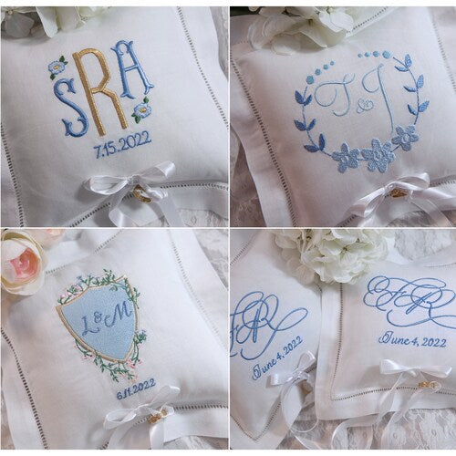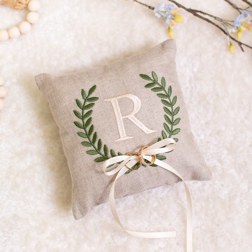 Monogrammed Linen Ring Bearer Pillow – Personalized Wedding Ring Cushion