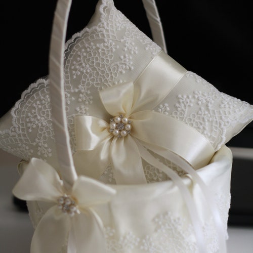 Ivory Flower Girl Basket & Ring Bearer Pillow Set | Lace & Pearl Accent