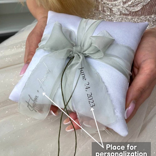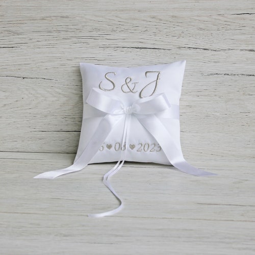 Personalized Silver Embroidered Ring Bearer Pillow – Handmade Satin Wedding Cushion