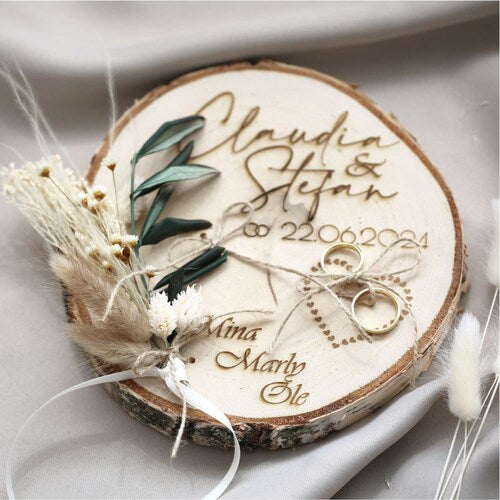 Personalized Boho Wedding Ring Holder – Engraved Wooden Disc with Dried Flowers
