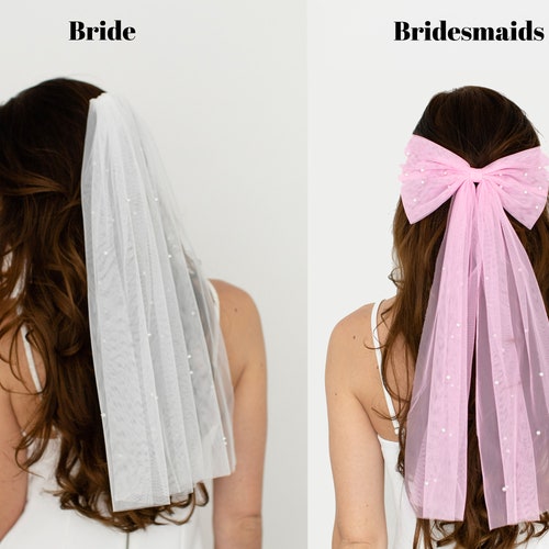 Bridal Pearl Bow Hair Accessory with Veil for Wedding or Bachelorette
