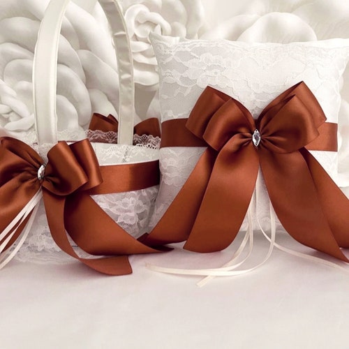 Rust Wedding Set: Flower Girl Basket, Ring Bearer Pillow, Cake Knife Set & Garter