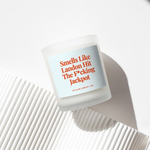 Personalized Engagement Candle – "Smells Like Landon Hit the Jackpot" Funny Custom Gift for Weddings, Bachelorette Parties, and More