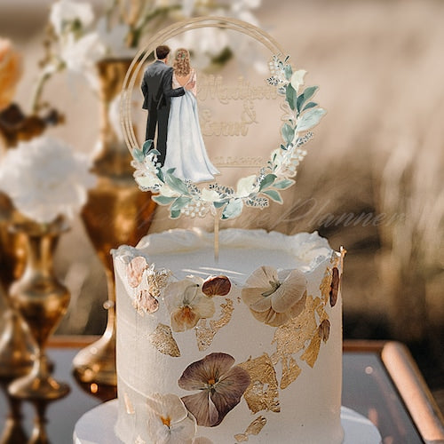 Personalized Greenery Wedding Cake Topper – Couple Silhouette with Dress & Suit Design
