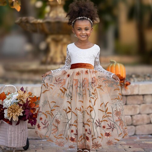 Embrace the elegance of fall with our Champagne Floral Tulle Flower Girl Dress, the perfect choice for a rustic, boho, or vintage-inspired wedding. This stunning long-sleeve dress features an embroidered flower overlay in soft champagne tulle, making your little one feel like a princess. The V-shaped back adorned with eyelash lace adds a touch of sophistication and charm, while the customizable sash options allow you to add a personal flair.