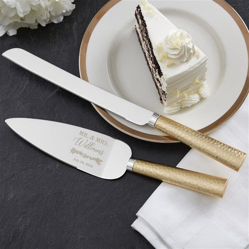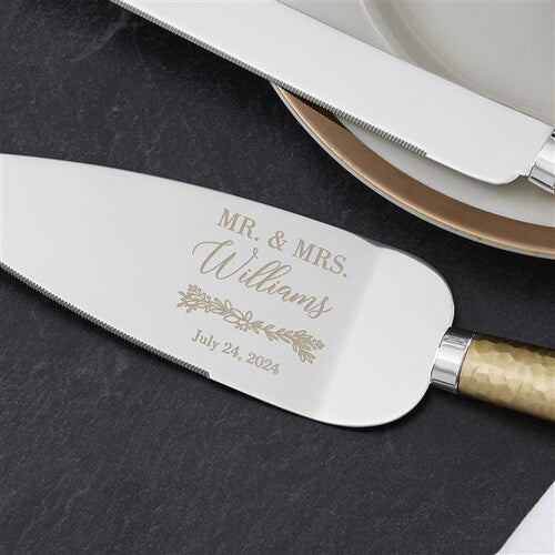 Laurels of Love Gold Hammered Cake Knife & Server or Champagne Flute Set