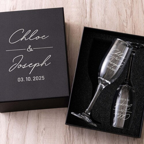 Crafted from premium glass, these flutes feature a tall, slender design that enhances the champagne experience by keeping bubbles alive longer. Whether used during your celebration or treasured as a keepsake, these flutes are a beautiful reminder of your love and commitment. They also make a thoughtful gift for newlyweds, bridal parties, or close family and friends.