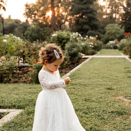 This charming lace flower girl dress combines timeless elegance with a modern touch, making it the perfect choice for flower girls, junior bridesmaids, or even a first communion. Featuring intricate openwork lace over a soft, coordinating lining, this dress is designed with a scalloped low-back bodice and an empire waistline that flatters all. The tea-length, A-line skirt adds an airy and playful vibe, ideal for any special occasion. Choose from classic white or ivory for a look that complements any wedding or event theme, whether rustic, vintage, or bohemian.